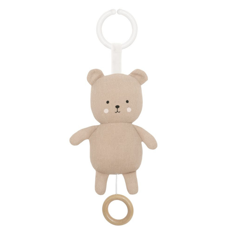 Söt speldosa i form av en nalle att hänga i barnvagnen. Låt ditt barn få slumra till med en rogivande melodi. Speldosan sätter man lätt fast med hjälp av en tillhörande ring och fungerar nästan överallt. Tillverkad i mjukaste textil . Speldosan är även fin som dopgåva till den nyfödde. Tillverkad av muslinvävd bomull och fyllning polyester fiber. Observera att denna babyprodukt inte är en leksak. Speldosan ska skötas av en vuxen och monteras på avstånd från barnets räckvidd. Speldosan ska inte användas i en babysitter där barnet kan nå speldosan