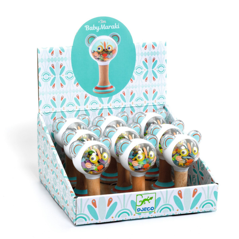 En fin skallra eller maraccas med ett gulligt djurhuvud på ett handtag. Greppvänlig för små babyhänder och fylld med pärlor i form av stjärnor och konfetti. I samma fina färger som övriga Baby White sortimentet. Handtaget är tillverkat i trä och sparsamt målat i giftfria färger, skallerdelen eller huvudet är i plast. Storlek: 5,5 x 6,8 x 10,5 cm. Levereras i en display innehållande 9 skallror. Från 3 månader