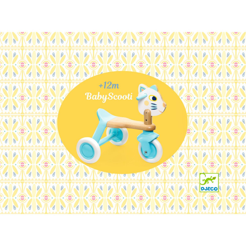 En kul slags trehjulig sparkcykel, åk-leksak eller springcykel att sitta på och gå eller sparka framåt med fötterna, för de barn som kan sitta stadigt men inte klarar av pedaler än. Med sin enkla design och ljusa, mjuka färger samt sitt roliga katthuvud blir denna baby trehjuling ett snyggt inslag i barnrummet. Katthuvudet har handtag att hålla i sig med och som styr framhjulet, vilket är en bra övning inför framtida cyklar. Hjulen är gummibelagda för att rulla mjukare och tystare över golven, och bakänden av trehjulingens sits är uppsvängd för att förhindra att barnet glider av. Trehjulingen är tillverkad av hållbart gummiträ samt plast och kräver montering innan den kan användas. Från 12 månader. Storlek på trehjulingen: H38 x B46 x D37 cm.