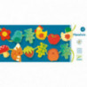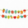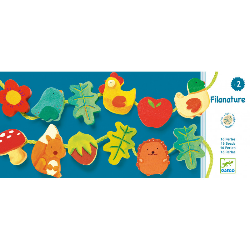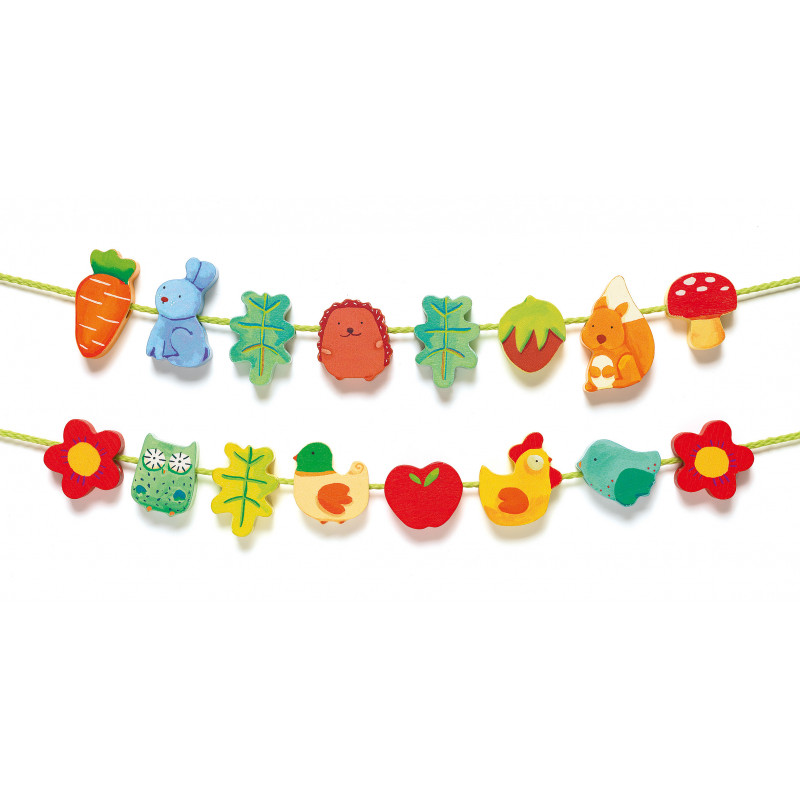 Ett kul sätt att träna upp finmotoriken. Fina träpärlor med stora hål och motiv från trädgården; löv, växter, frukter och små djur. Använd detta till att skapa fina halsband eller dekorationer, eller gör det bara för att det är kul och återanvänd allt nästa gång. Innehåller 16 pärlor och två gröna snoddar/band att trä pärlorna på. Från 2 år