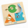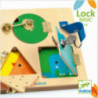 En rolig leksak för att öva upp motoriken som behövs för att öppna lås och liknande. Bakom tre luckor som är stänga med varit lås - hasp, skjutregel och nyckel-lås - finns roliga bilder på djur i klara färger. Tillverkad i trä med beslag i metall. Från 3 år.