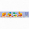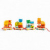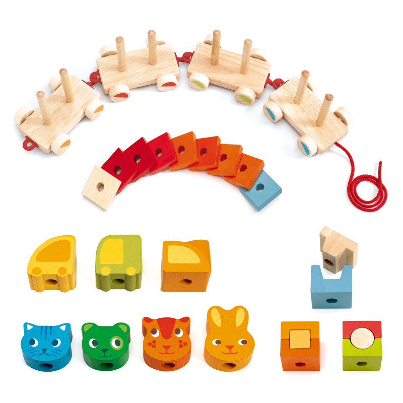En kul dragleksak och byggklossar i ett! Ett färgglatt tåg med fyra vagnar som håller hela 30 stycken roliga träklossar i olika former som kan byggas ihop hur man vill, och fyra av klossarna är formade som djurhuvuden så att tåget har några passagerare. Varje vagn har två pinnar att trä klossarna på så att de inte trillar av på vägen, och då vagnarna är ihopkopplade med krokar kan vagnarna kopplas bort om man vill. Det finns många roliga sätt barnet kan bygga ihop det fina tåget och dra runt på det för att visa upp resultatet, men klossarna kan lika bra lekas med separat och har tillräckligt varierande former för att utmana barnets förståelse för balans och hur olika former passar ihop. Från 18 månader. Storlek: 61 x 10,5 x 10 cm.