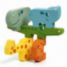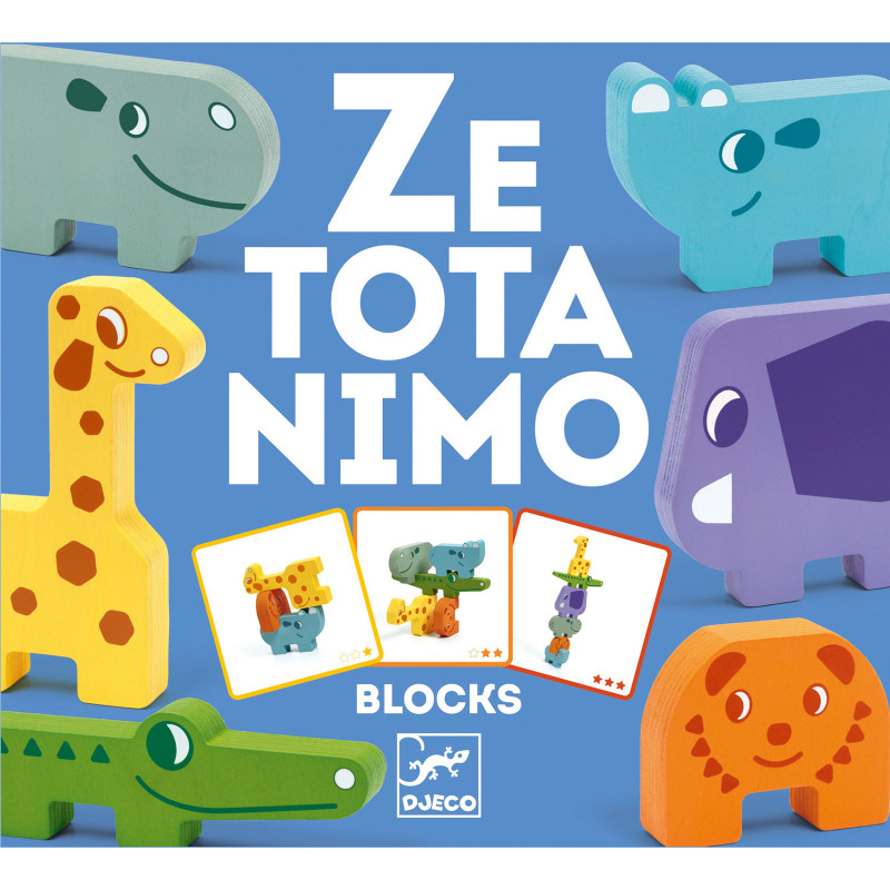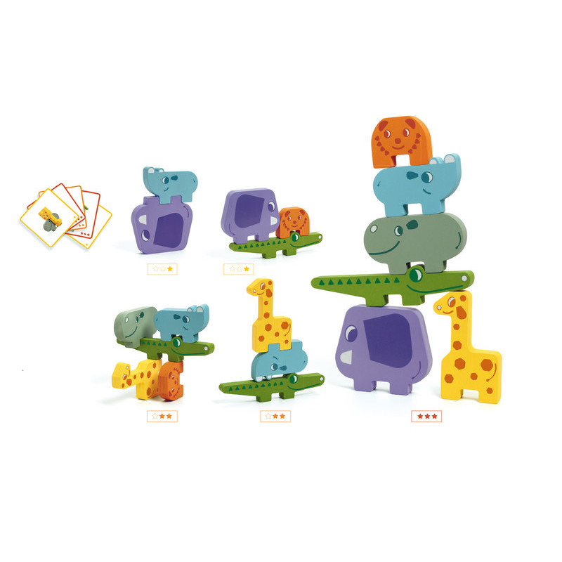 Roliga stapeldjur i härliga färger, former och modeller. Tillverkade i trä och målade i giftfria färger i glada nyanser. Förpackningen innehåller 6 olika djur som är stapelbara på olika sätt och 20 kort med stapel-utmaningar med tre olika svårighetsgrader. Högsta djuret är ca 11 cm högt. Från +3 år