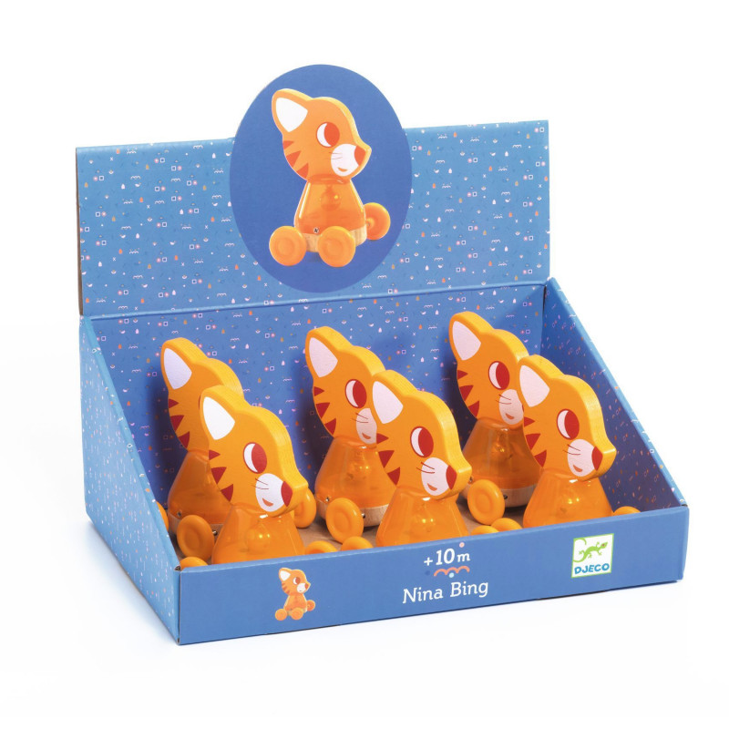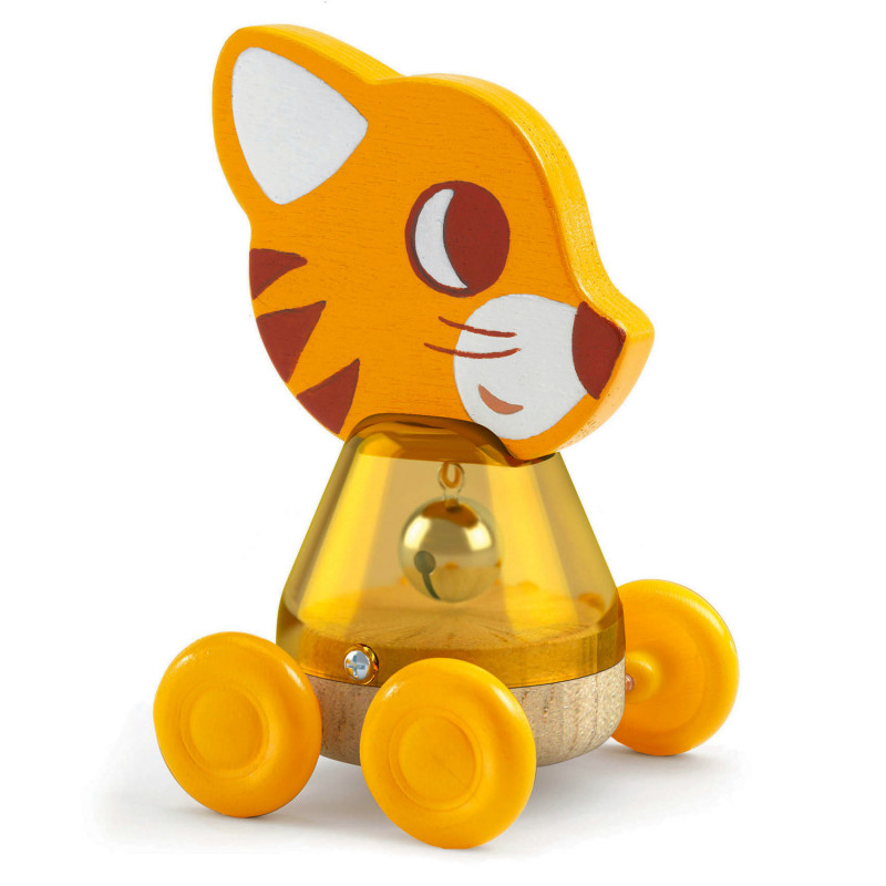 En rolig liten katt på hjul med en bjällra inuti sin genomskinliga gula mage som plingar när katten rör på sig. En kul rulleksak för de yngsta med hjul som rullar lätt över golvet och ett figursågat katthuvud överst. Tillverkad i trä, plast och metall. Storlek rulleksak: 11 x 7 x 7 cm. Från +10 månader. Storlek rulleksak: 11 x 7 x 7 cm.