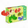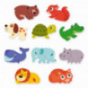 Tio stycken kul små-pussel för nybörjaren. Här kan man också träna på att känna igen olika djur och olika färger. Varje djur består av två bitar. Tillverkade av kraftig kartong. Förpackningen innehåller 10 olika djur/20 bitar. Från +2 år.
