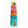 Ett set med 6 snyggt dekorerade stapelklossar i olika storlek som är numrerade och utformade som bostäder till de 6 olika djuren som medföljer i setet. Mängder av olika sätt att leka med detta set! Klossarna kan användas som enskilda hus för att bilda en bondgård eller staplas i ordning för att skapa ett högt torn, och de olika djuren kan lekas med separat eller ihop med sina hus i kuberna. Ett kul sätt att lära sig om bondgårds-djur, siffror, former och färger. Kuberna är tillverkade i kraftig och hållbar papp/kartong och passar i varandra för kompakt förvaring. Setet innehåller: 6 kuber och 6 bondgårds-djur i plast (ko, hund, gris, katt, kanin och höna). Från 18 månader