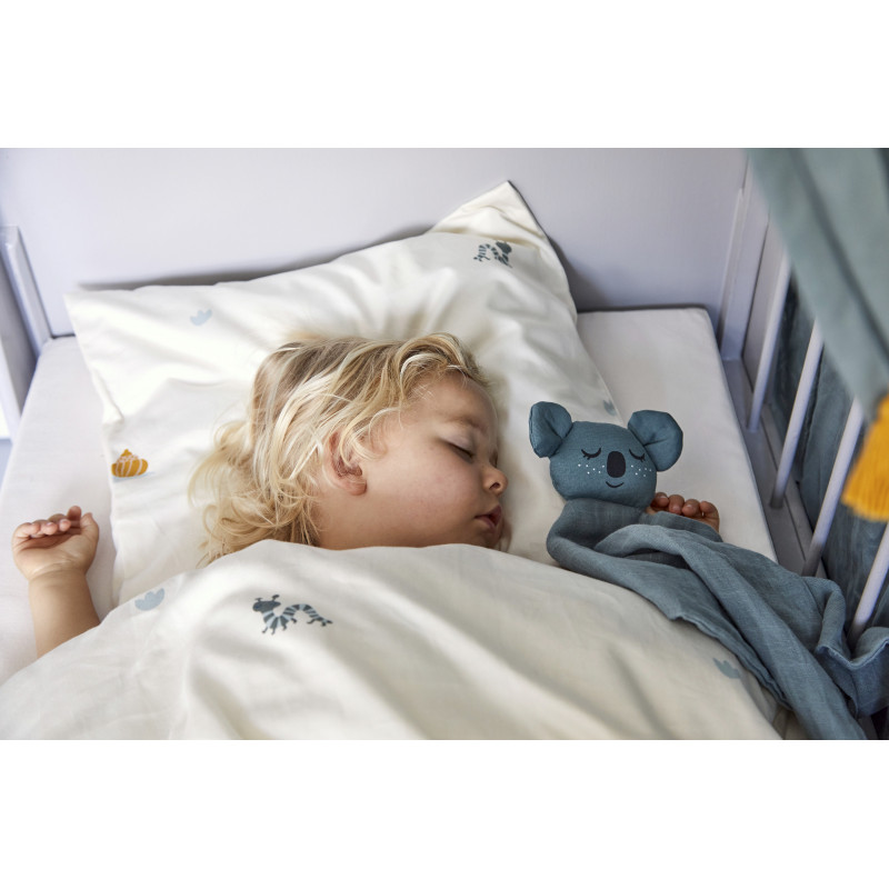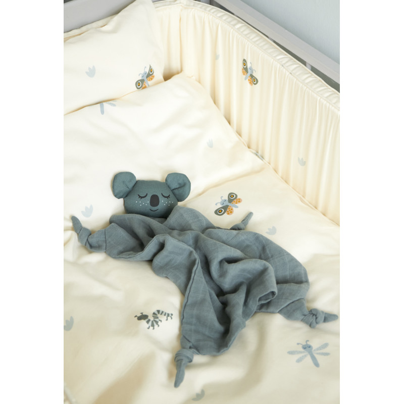 Ett mjukt och skönt set med sängkläder för baby, gräddvit bottenfärg med små ljusblå blommor och roliga bilder av diverse fjärilar, trollsländor och larver. Lent och gosigt med knappar som stängning. Setet kommer i en matchande tygkasse och innehåller ett påslakan samt ett örngott. Tyget är satin-vävt av GOTS-certifierad 100% bomull av hög kvalitet och med tryckt design. Tvättas i 30-60 graderC skontvätt och hängtorkas.