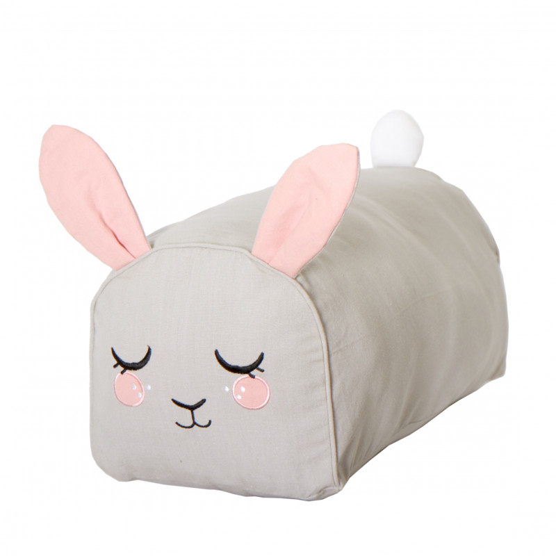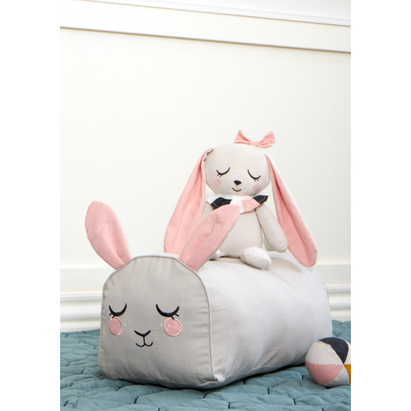 En kul ljusgrå sittpuff i form av en kanin med långa öron. Eftersom puffen är avlång och har plan undersida och rundad översida kan den också fungera som extra armstöd i soffan. OEKO-TEX certifierad och tillverkad i ekologisk bomull med polyester fyllning och broderad design.