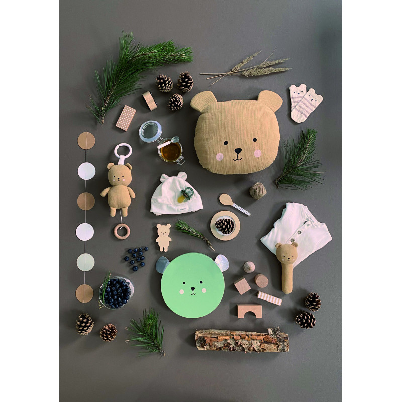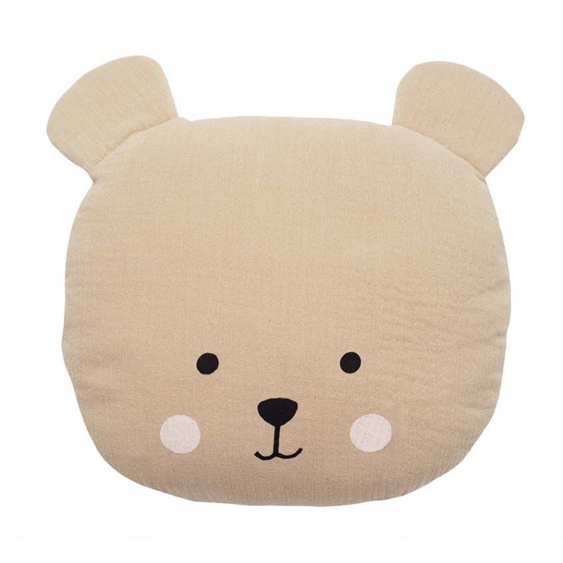 Handsydd nallekudde som blir en dekorativ inredningsdetalj i barnrummet. Den är lika söt för sig själv som tillsammans med andra prydnadskuddar. Nallekudden är varsamt handsydd. Handtvätt, ej torktumling. Tillverkad av mjukaste muslinvävd bomull och fyllning polyester fiber.