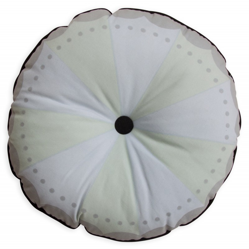 Rund kudde i ekologisk bomull med tryckt mönster i mint, ljusblått och grått från Frank & Poppy. Svart knapp i mitten samt svart paspoal.
