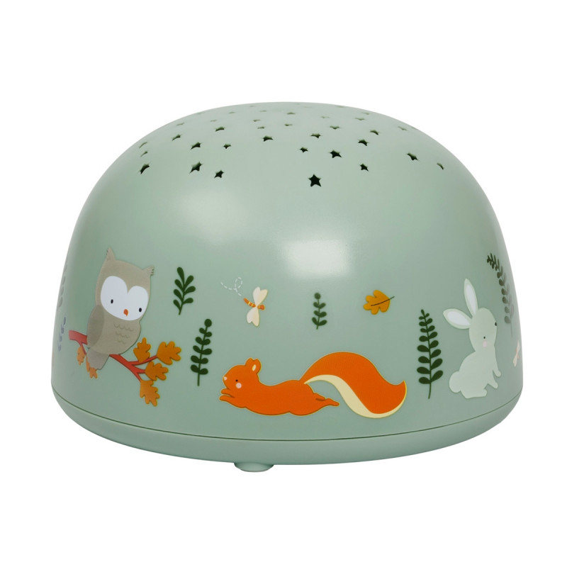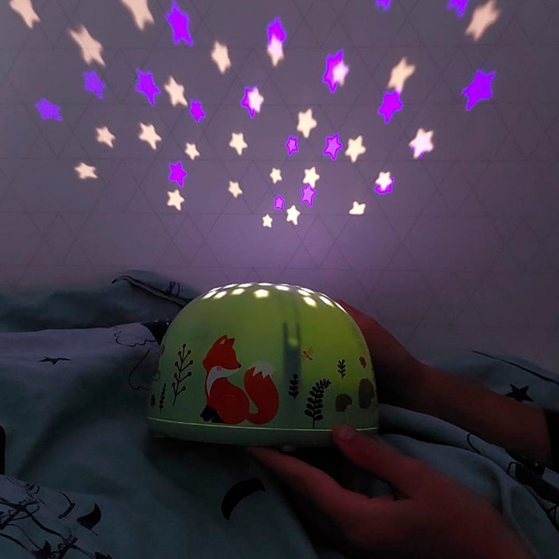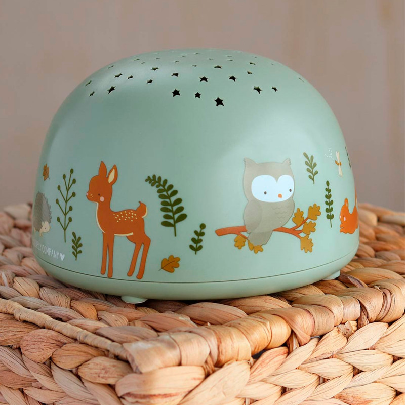 Projektorlampa i ljust grön med motiv från skogen. Lampan lyser med stjärnor på tak och väggar i barnrummet. Ett mysigt ljus att somna till.