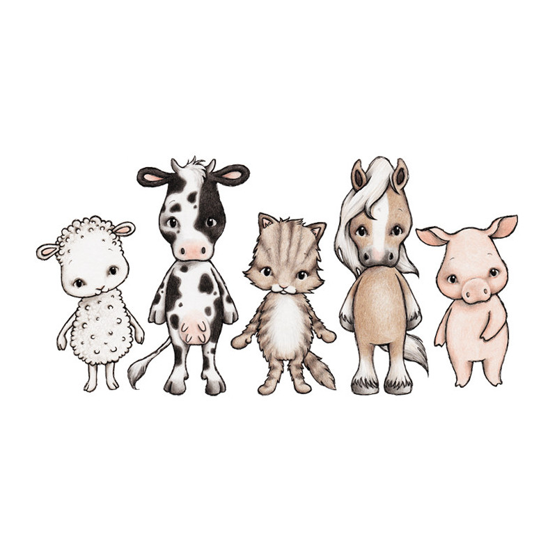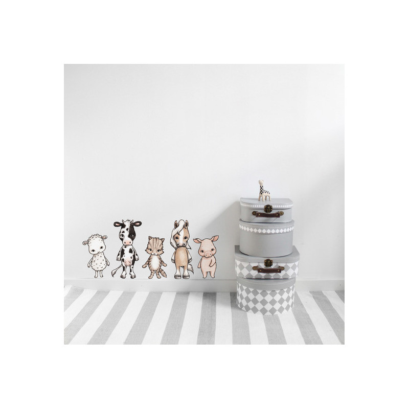 Det här är Bondgårdens vänner! Lammet Charlie, kon Coco, katten Chat, hästen Cherie & sist men inte minst grisen Cassie. Kirra alla fem vänner eller sätt ihop ditt eget gäng! Bondgårdens vänner är flyttbara konstverk för målade väggar, målad tapet och tjockare typer av tapet.