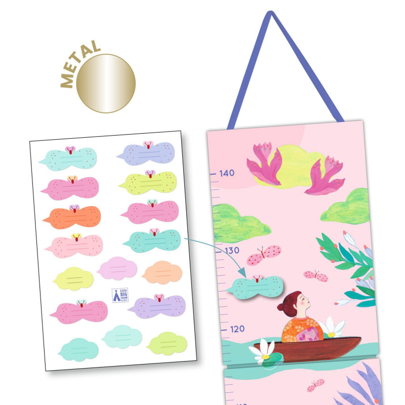 En mätsticka, illustrerad med motiv från en sjö, som hängs upp på väggen och som kommer med många återanvändbara klistermärken där ni kan skriva till exempel barnets namn och ålder. Snygga illustrationer med metallglänsande detaljer som visar barn och djur som har det trevligt i naturen i och runt en sjö. En snygg dekoration som kan passa i de flesta rum och där ni kan mäta och markera allt eftersom barnet eller barnen växer (upp till 140 cm eller ungefär 10 år). När barnen väl har växt upp blir mätstickan en härlig minnessak som kan vikas ihop och stoppas undan i sin snygga låda. Mätstickan mäter mellan 60 och 140 cm, så var ganska noggrann när ni hänger upp den. Tillverkad av FSC®️ certifierad kartong och papper. Innehåll: 1 utvikbar mätsticka (90 x 20 cm) med ett färgat band att hänga upp den i, 16 återanvändbara klistermärken och 1 snygg förvaringsask.