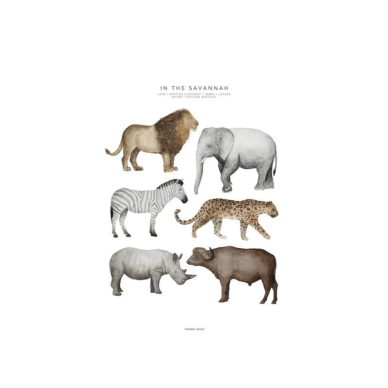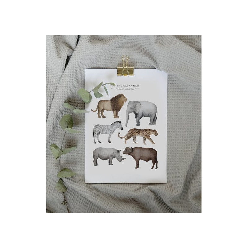 En poster av en akvarellmålning för barnrummet. På motivet syns ett lejon, en afrikansk elefant, zebra, leopard, noshörning ocn en afrikansk buffel. Ram ingår ej.