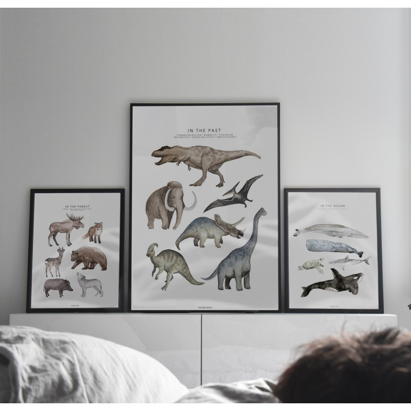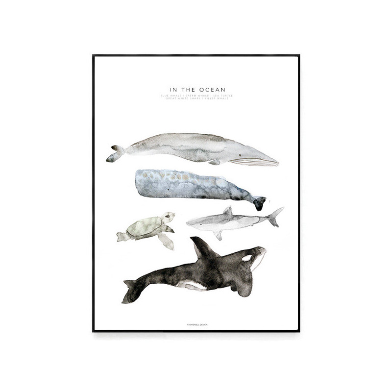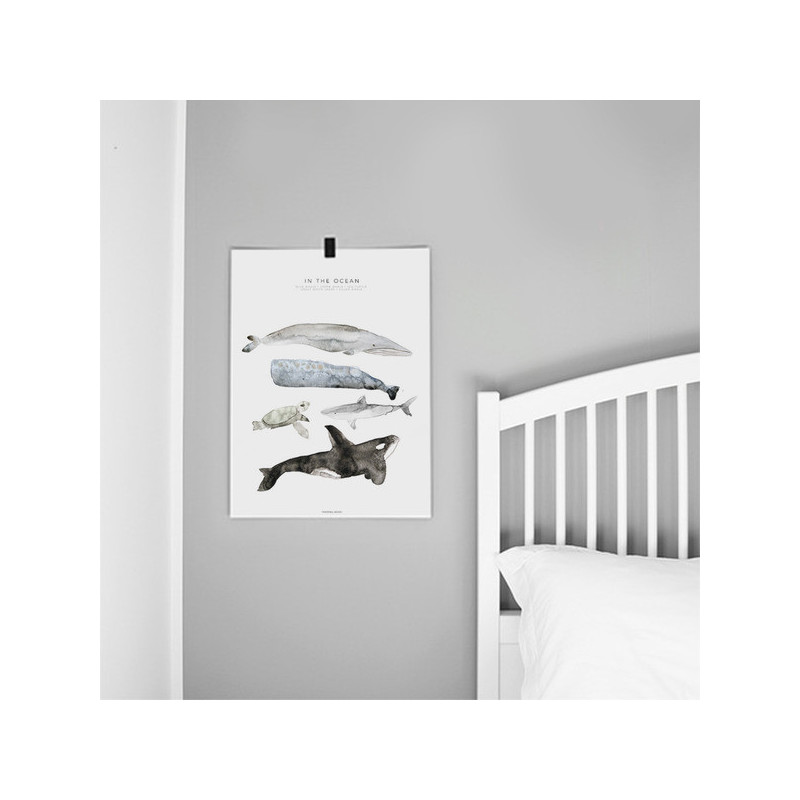 En ljuvlig poster av en akvarellmålning för barnrummet. På motivet syns en liknande blåval, kaskelot, havssköldpadda, vithaj samt späckhuggare. Postern för tankarna in i havets undervattensvärld.