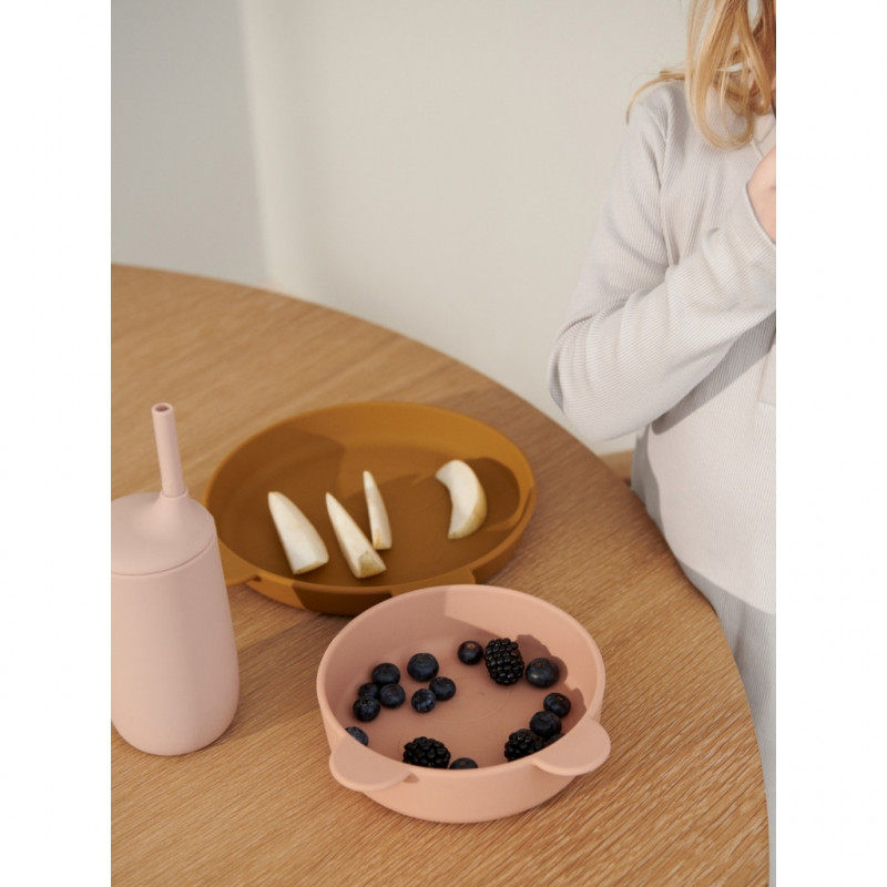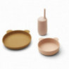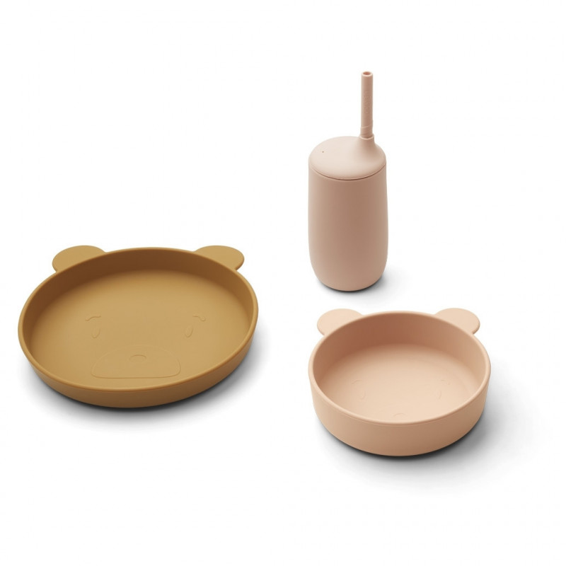 I den här fina servisen från Liewood ingår tallrik, skål och dryckesmugg. Allt tillverkat i mjuk silikon som inte går sönder om det hamnar i marken. Tål maskindisk men inte microvågsugn. Mugg: D: 7.3 cm. H: 15 cm. C: 300 ml straw: D: 1 cm. H: 17 cm. Skål: D: 15 cm. H: 4,5 cm.