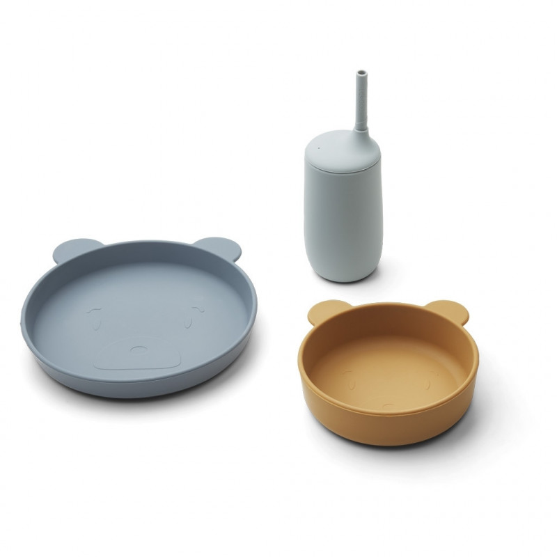 I den här fina servisen från Liewood ingår tallrik, skål och dryckesmugg. Allt tillverkat i mjuk silikon som inte går sönder om det hamnar i marken. Tål maskindisk men inte microvågsugn. Mugg: D: 7.3 cm. H: 15 cm. C: 300 ml straw: D: 1 cm. H: 17 cm. Skål: D: 15 cm. H: 4,5 cm.