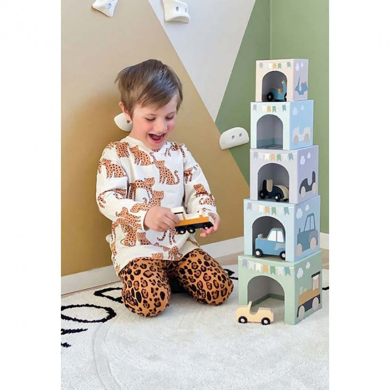 Största kuben som har siffran nr 5 är ca 15x15 cm. Ett enkelt, roligt och pedagogiskt sätt att lära sig räkna och lära sig namnen på de olika fordonen. De söta klossarna blir också en fin inredningsdetalj till barnrummet som ditt barn kan ha mycket roligt med. I de olika kuberna finns det olika fordon som du kan leka med och flytta runt mellan de olika husen. I varje liten kub finns ett fordonen. 1 tåg 1 jeep 1 traktor 1 sportbil 1 scooter
