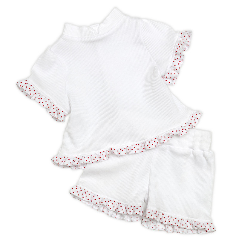 Skrållans pyjamas är mjuk och skön för dockan. Pyjamasen är vit och har söta rödprickiga volanger. Den är tvådelad och har korta ärmar och ben, mycket mysigt tycker Skrållan.