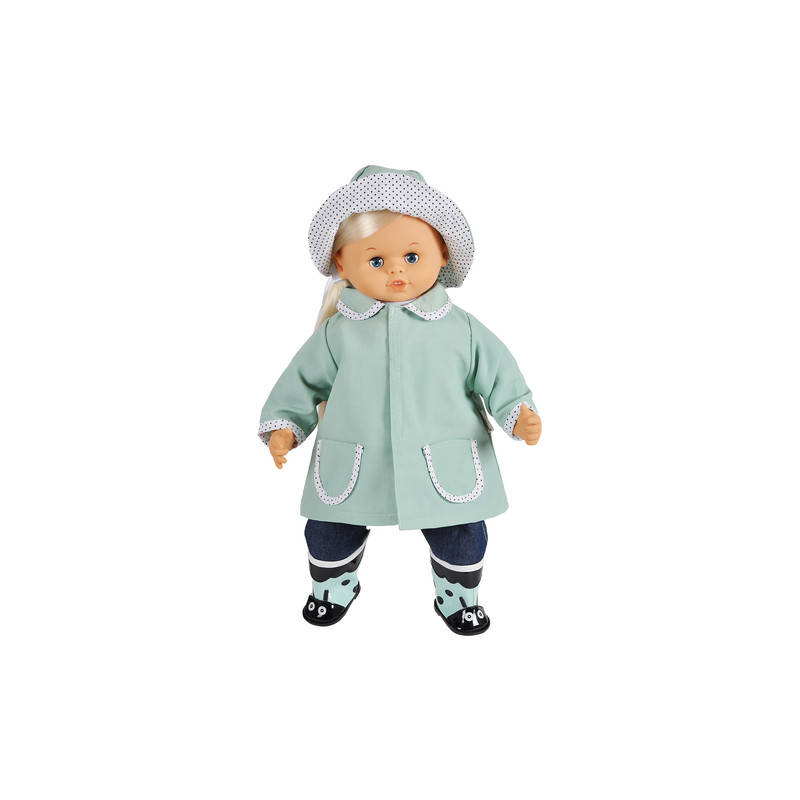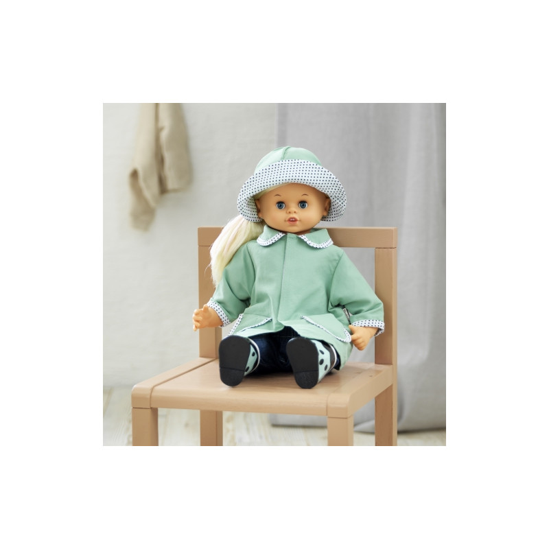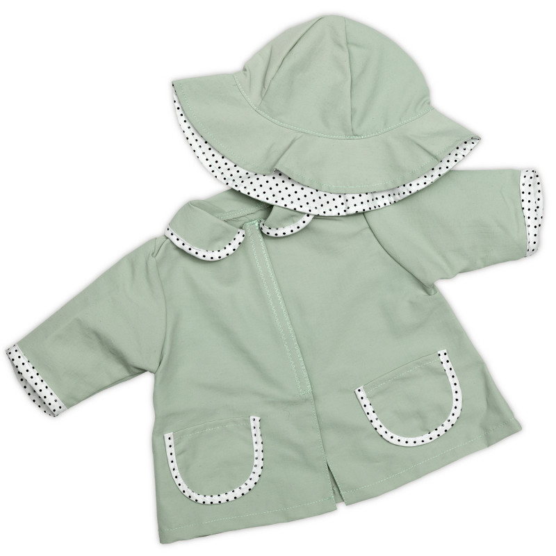 Ta med Skrållan ut på promenad i regnet! Med den här regnjackan och regnhatten håller hon sig torr när regnet öser ner. Dockkläderna är gjorda av vattenavvisande tyg i snygg färg och vitt foder med svarta små prickar, fint och praktiskt så att ni alltid kan vara ute tillsammans, oavsett väder!