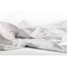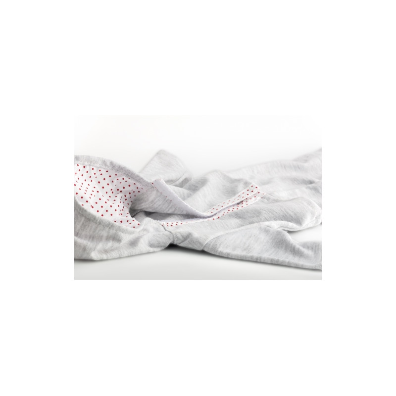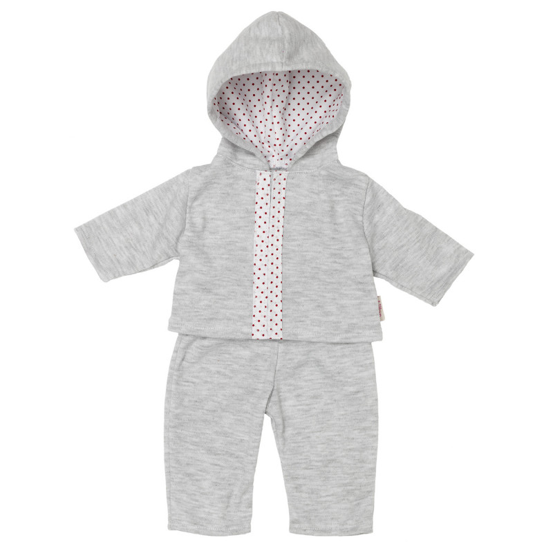 Mjuk och skön mysdress i grått med vit- och rödprickiga detaljer. Setet innehåller en luvjacka och ett par byxor. Dessa kläder passar perfekt till vår taldocka Lillan.