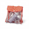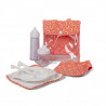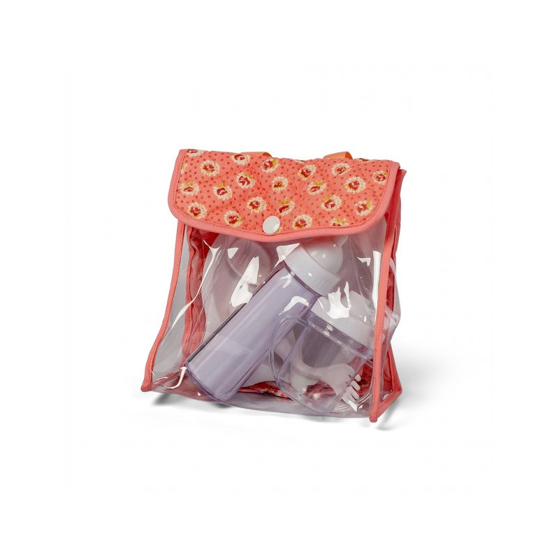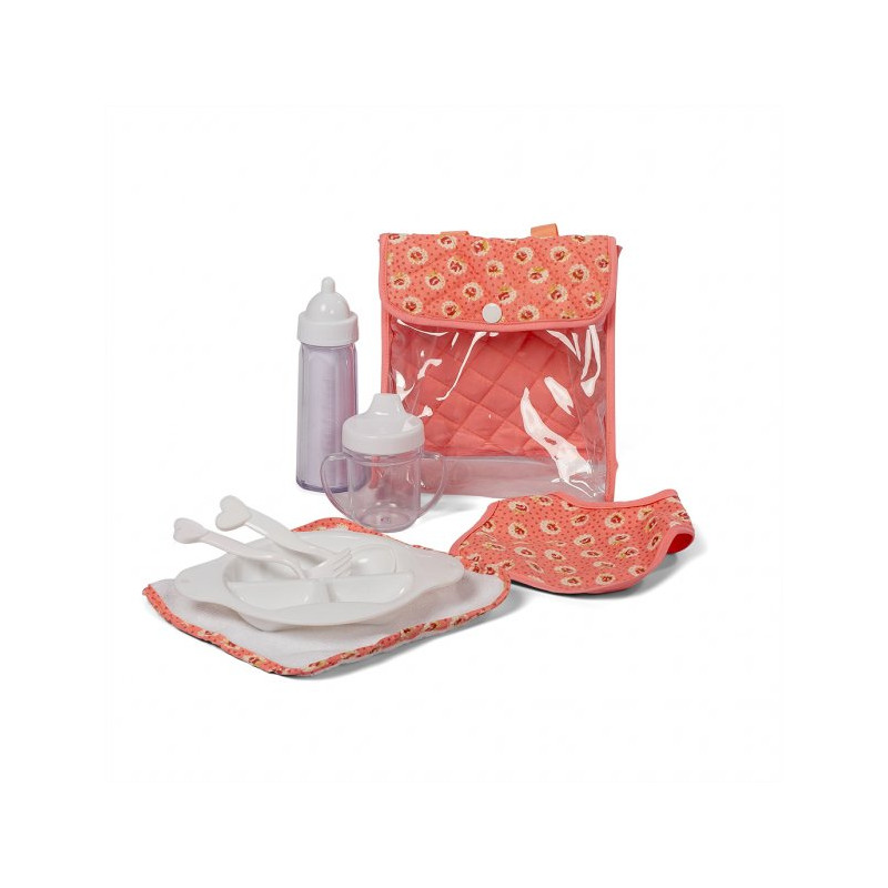 Ta hand om din docka med dessa fina tillbehör, där väskan är packad med allt för matningen. Nappflaska, pipmugg, tallrik, bestick, underlägg, och haklapp. Fint matchande mönster på väska och haklapp.