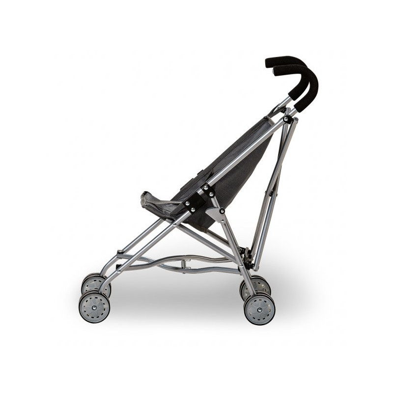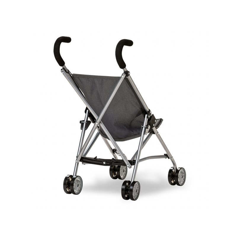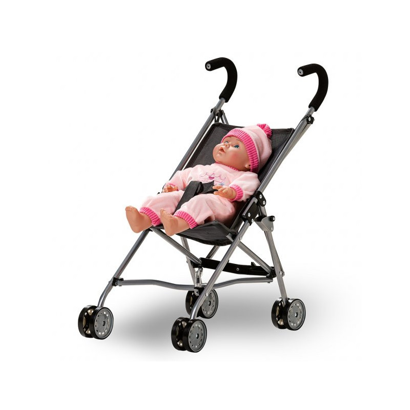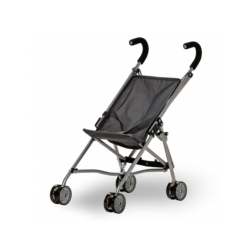 Ta med din docka eller ditt gosedjur på promenad i denna grå paraplysulky. Vagnen har fyra hjul och dockan kan spännas fast för en säker färd.Vagnen kan fällas ihop för att bli mindre när den ska förvaras eller packas med i bilen.