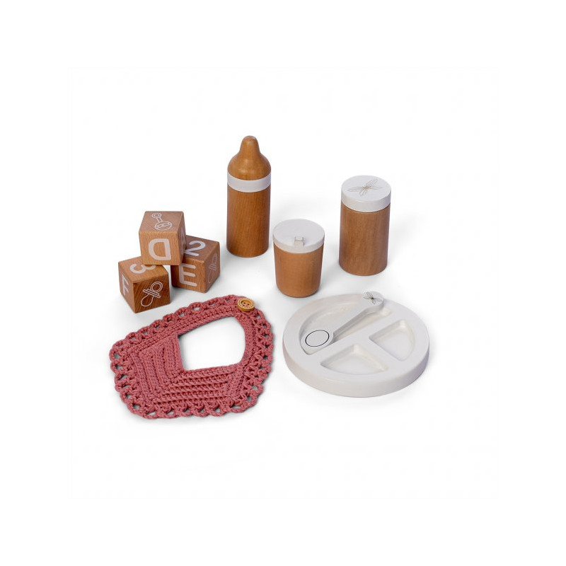 Gör rollspel ännu roligare med den här leksetet för dockan innehållande totalt 9 delar. Virkad haklapp, nappflaska, pipmugg, tallrik, sked, burk med lock samt 3 klossar för lek efter maten.