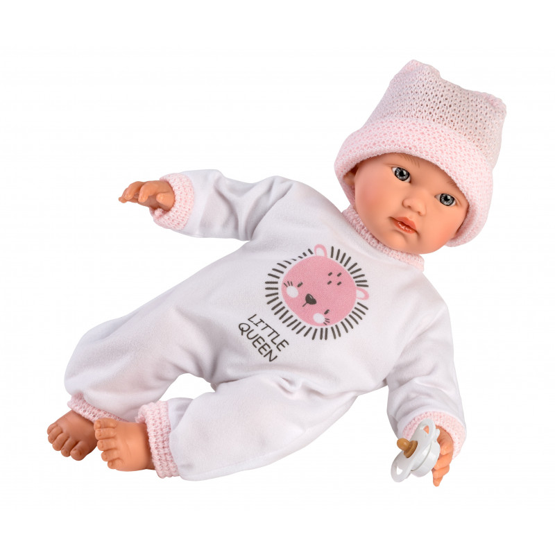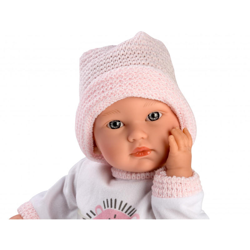Lisa är klädd i vit body med rosa tryck och rosa mössa. Det ingår en randig sovsäck som går att bära som en väska. Dockan har ljud och gråter när man trycker på magen. Napp ingår.
