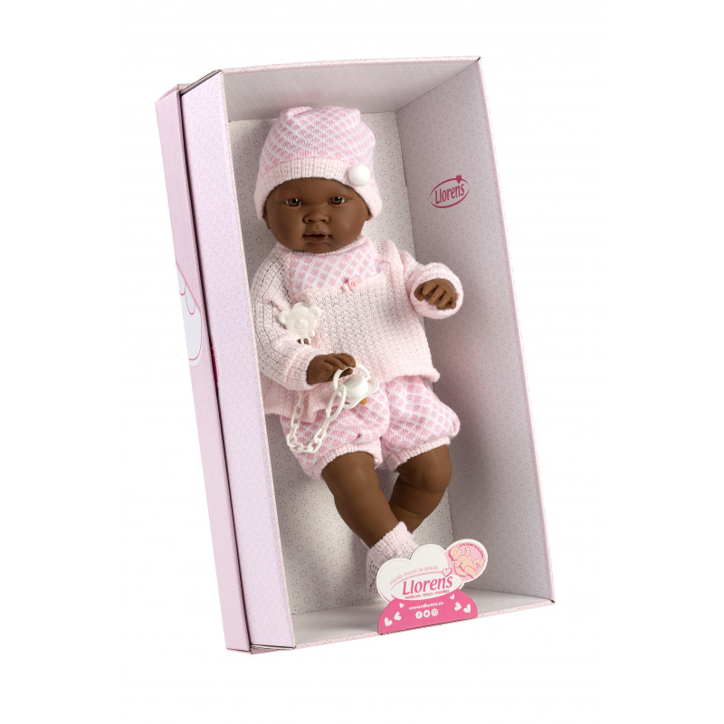 Nahia är en mörkhyad babydocka utan ljud med vinylkropp. Hon är klädd i stickad tröja, korta byxor, sockar och mössa i rosa toner. Det medföljer napp med hållare.