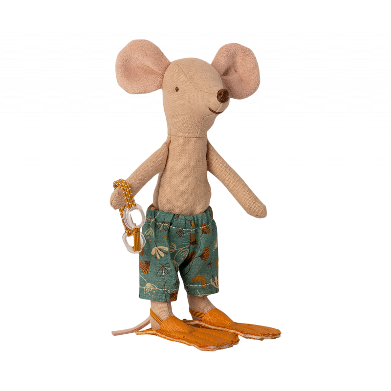 Nu kan även dina gosedjur följa med till stranden och sola och bada. Storebror mus har en egen badhytt och självklart även simfötter och simglasögon så att han kan simma snabbt i vattnet. Han är även klädd i ett par häftiga badshorts med palmmönster. Badhytten är tillverkad i kartong och har blå ränder.
