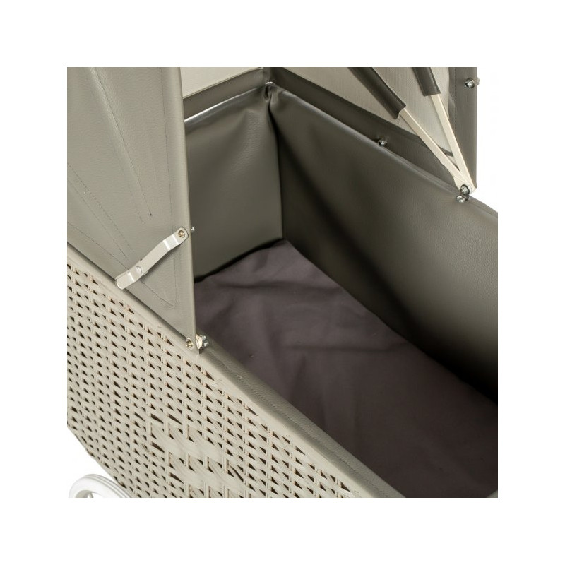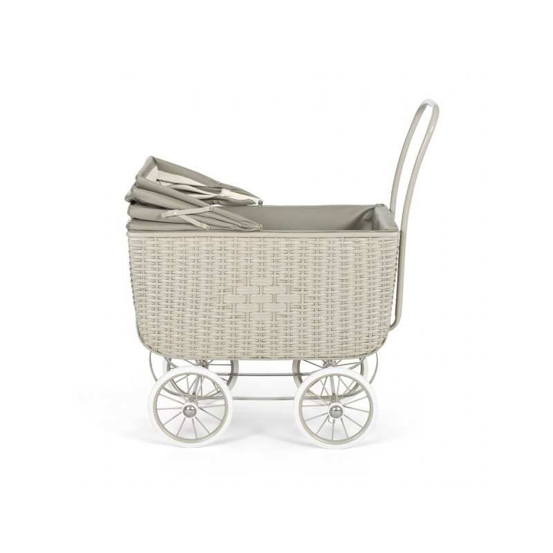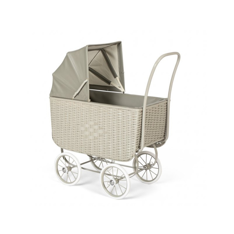 En lyxig vintage dockvagn i rotting med fina detaljer från Byastrup. Vagnen har fina färger och huvan kan fällas upp samt ned.