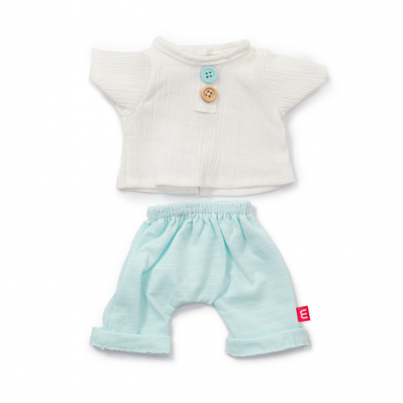 Vit tröja och turkos shorts. Miniland klädset är designat i Spanien och passar alla Miniland 38 cm dockor.