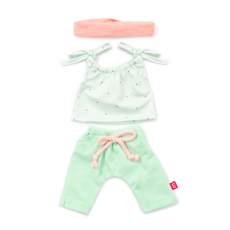 Grönprickig tunika, gröna shorts och rosa hårband. Miniland klädset är designat i Spanien och passar alla Miniland 38 cm dockor.