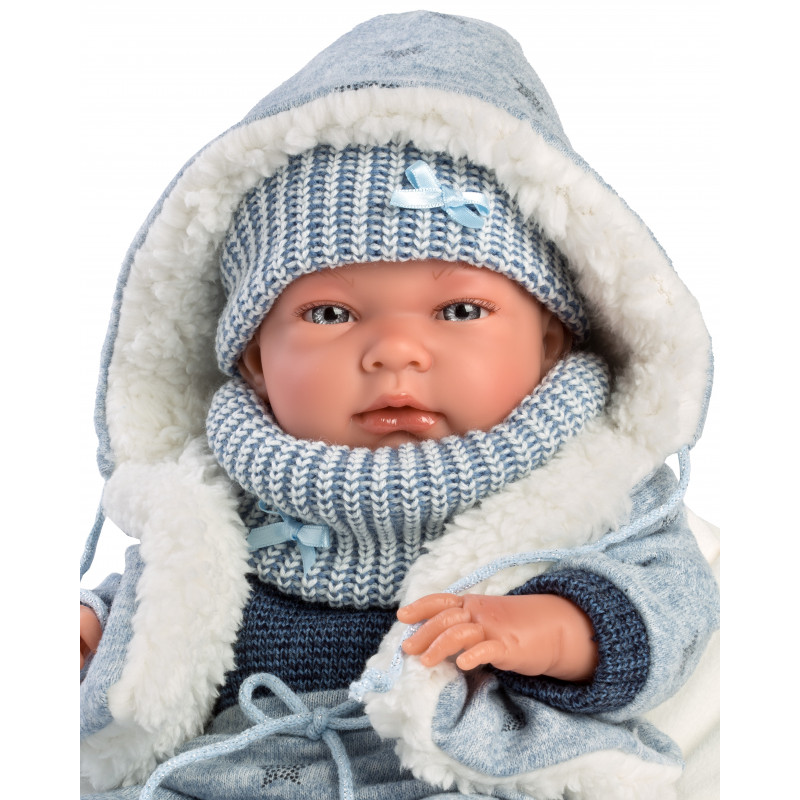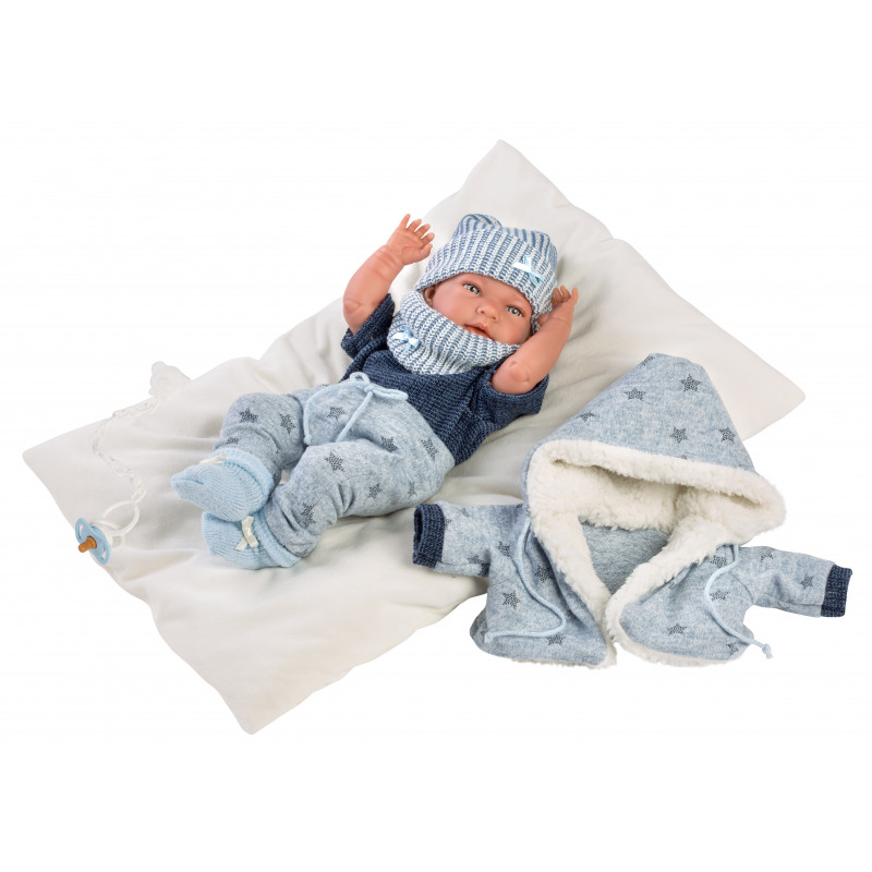 Hugo är en babydocka utan ljud. Han är klädd i blå stjänmönstrad jacka och byxor, stickad mössa och halsduk, blå tröja samt sockar. Napp och en vit madrass ingår.