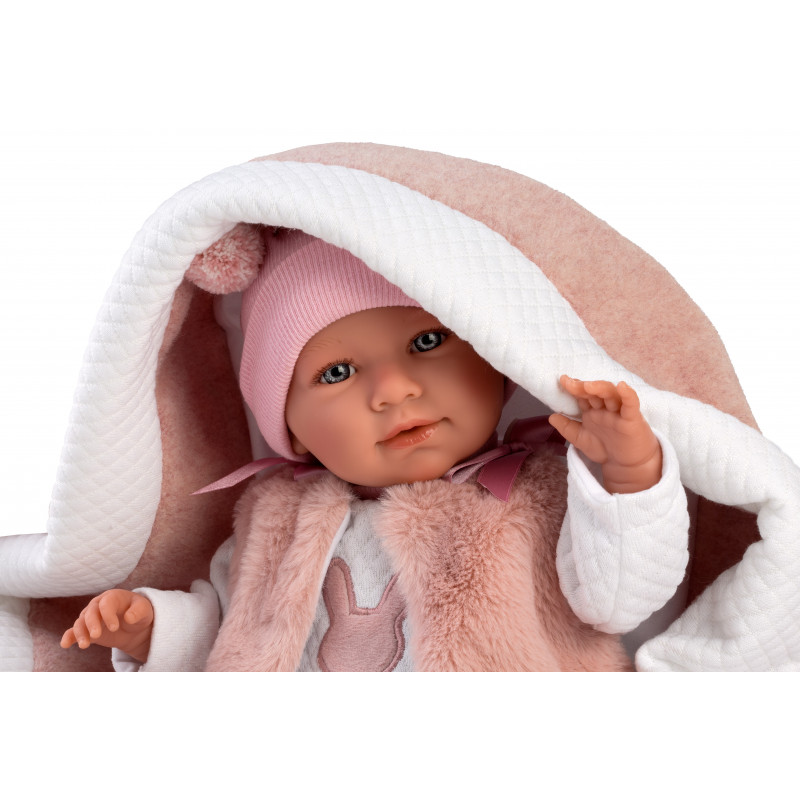 Tittut! I sin rosavita liggdel känner Celine sig trygg. Hon är klädd i vit sparkdräkt med en rosa kanin på magen. Över sparkdräkten värmer en rosa väst henne skönt och med en stickad mössa på huvudet och mysiga strumpor på fötterna är hon varm och nöjd.