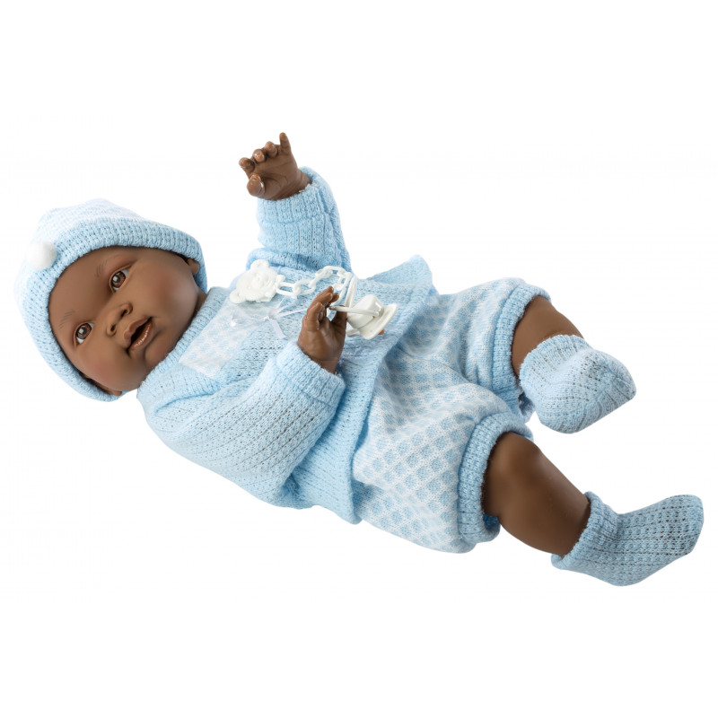 Noe är en mörkhyad babydocka utan ljud med vinylkropp. Han är klädd i stickad tröja, korta byxor, sockar och mössa i ljusblå toner. Det medföljer napp med hållare.