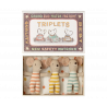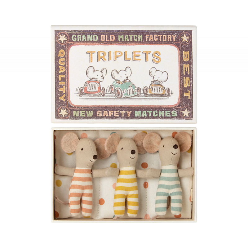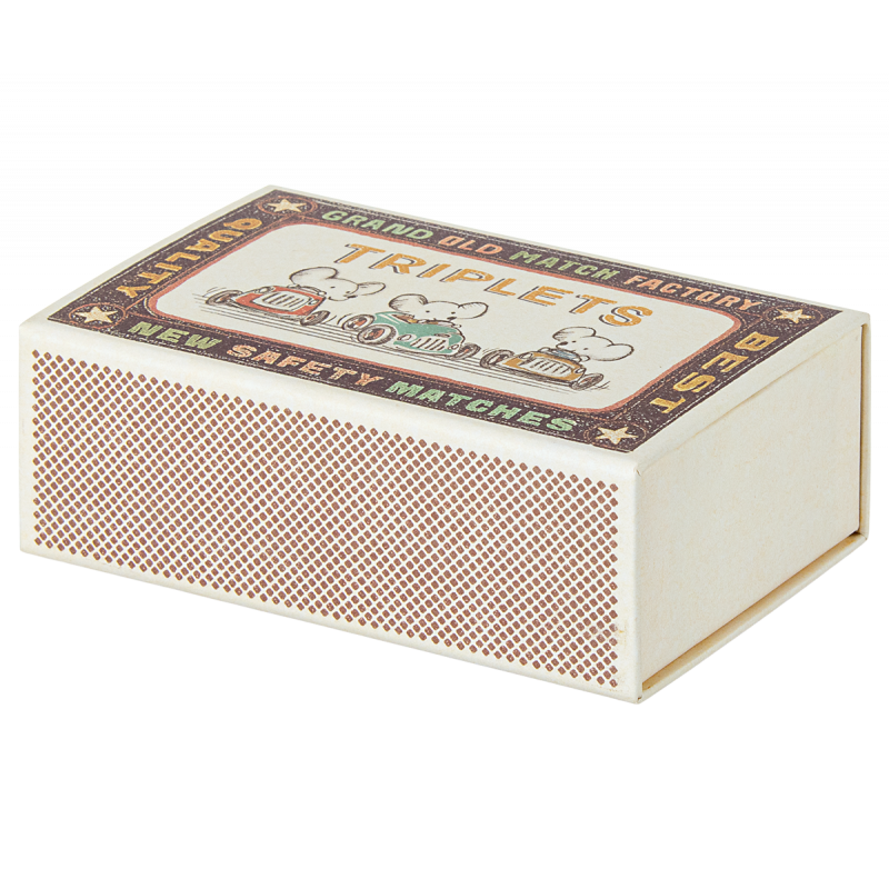 Nu kan du ha tre babymöss samtidigt. Stoppa trillingmössen försiktigt i sin tändsticksasksäng i en varm sovsäck där de sover tätt sida vid sida.
