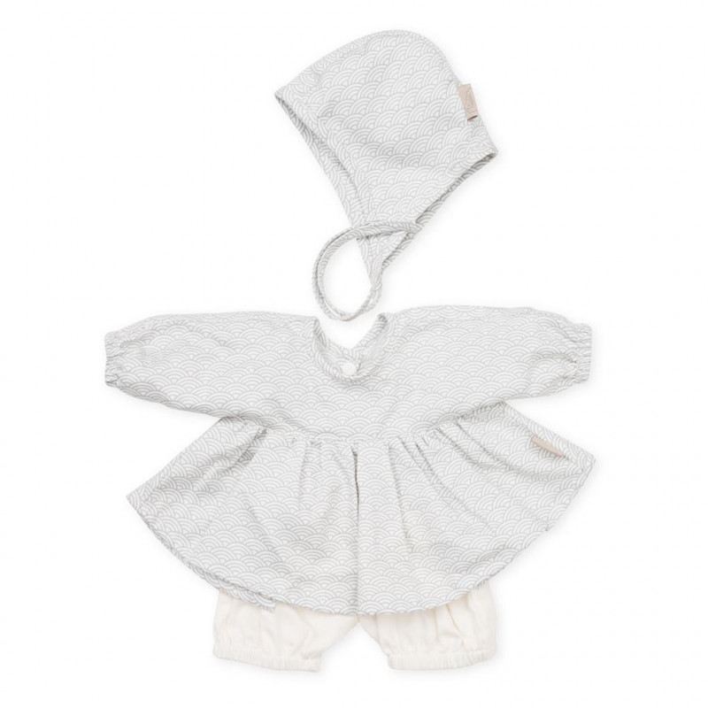 Vilken dockmamma skulle inte vilja ha dessa ljuvliga kläder till sin lilla bebis? Ett set med dockkläder innehåller tunika, kortbyxor och en liten mössa.