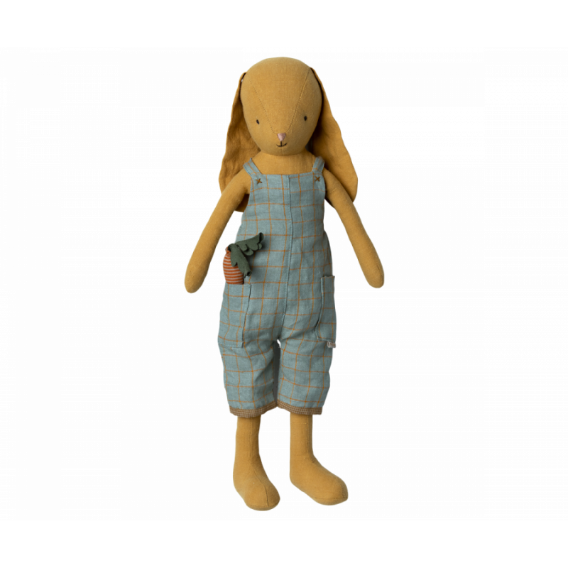 Maileg kanin i gul färg och med storlek 3 klädd i rutig blå overall. Titta en morot finns i fickan för hungriga stunder.