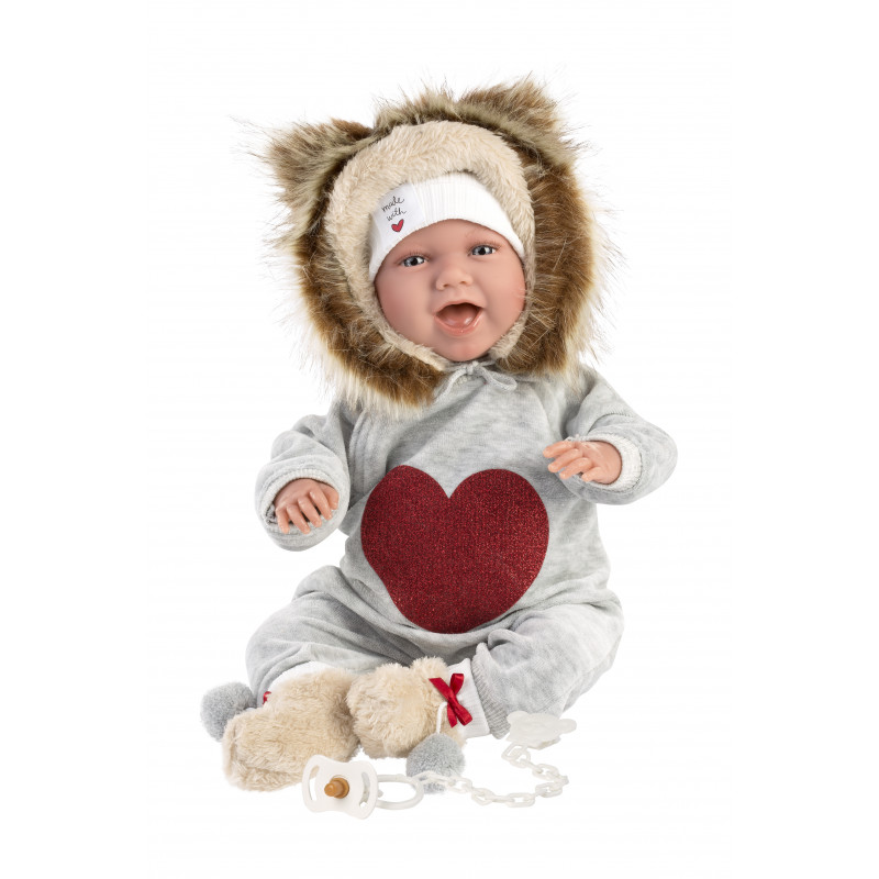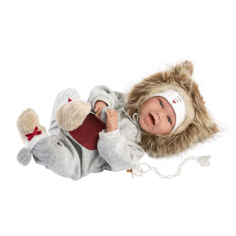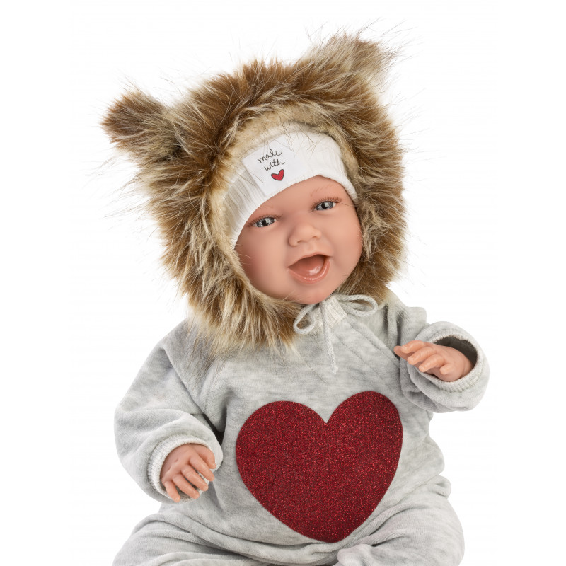 Det här är den skrattande dockan Smilla. Hon är klädd i grå sparkdräkt med stort hjärta på magen och gosig pälsmössa. När man trycker Smilla på kroppen så skrattar hon och säger "mama" och "papa".