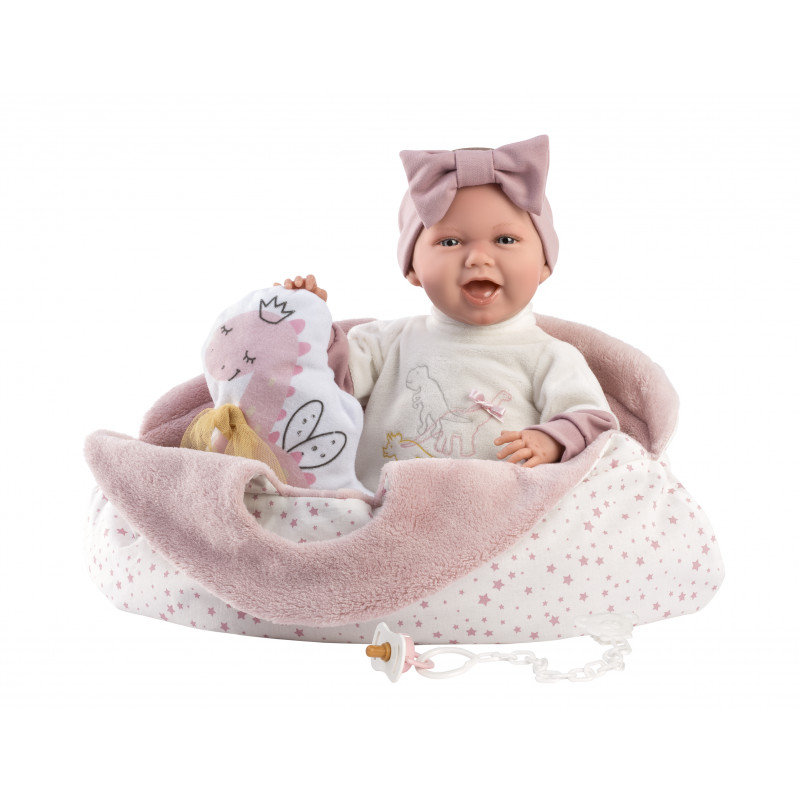 Mjuk korg, dino-gosedjur och napp med hållare medföljer.