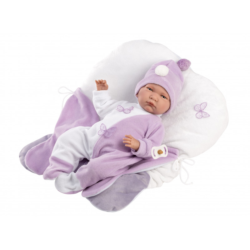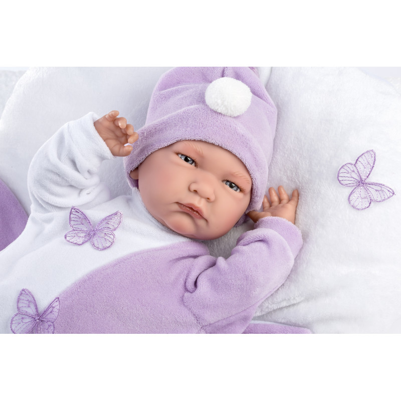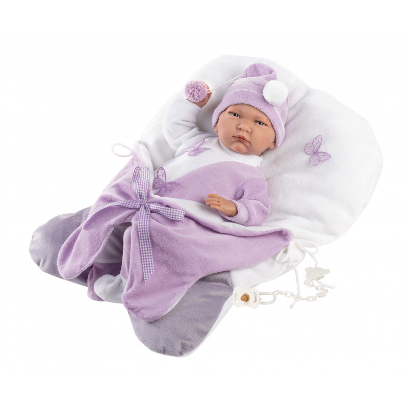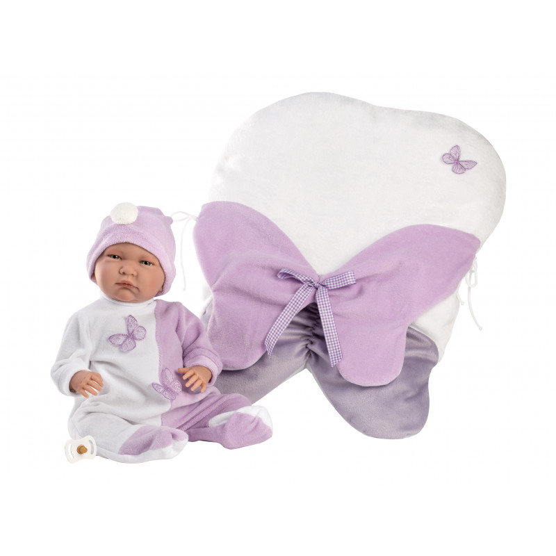 Det här är dockan Viola. Hon är klädd i vit och ljuslila sparkdräkt med fjärilar och lila mössa. När man trycker henne på kroppen så gråter hon och säger "mama" och "papa".