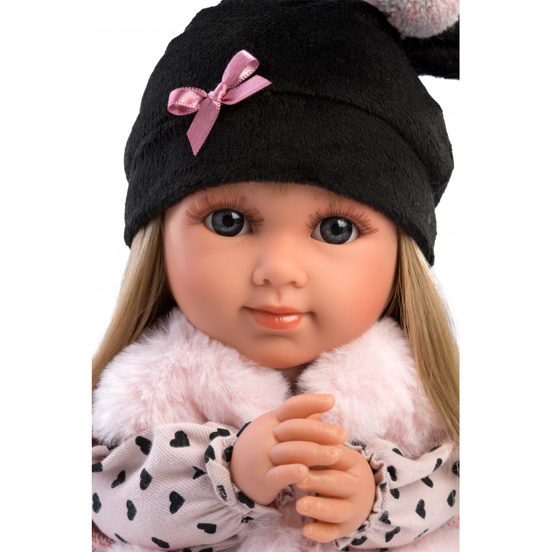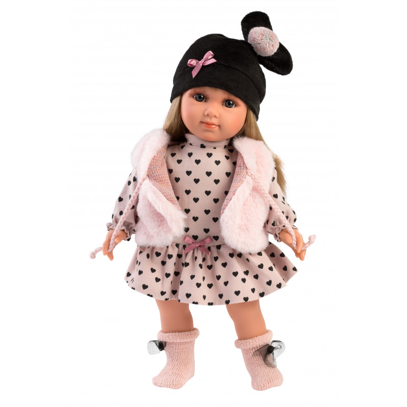 Mariella är klädd i hjärtmönstrad klänning, pälsväst, mössa och strumpor.