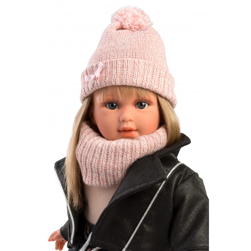 Natasha är klädd i svart mönstrad kjol, rosa tröja, svart jacka, rosa mössa, väska och strumpor.