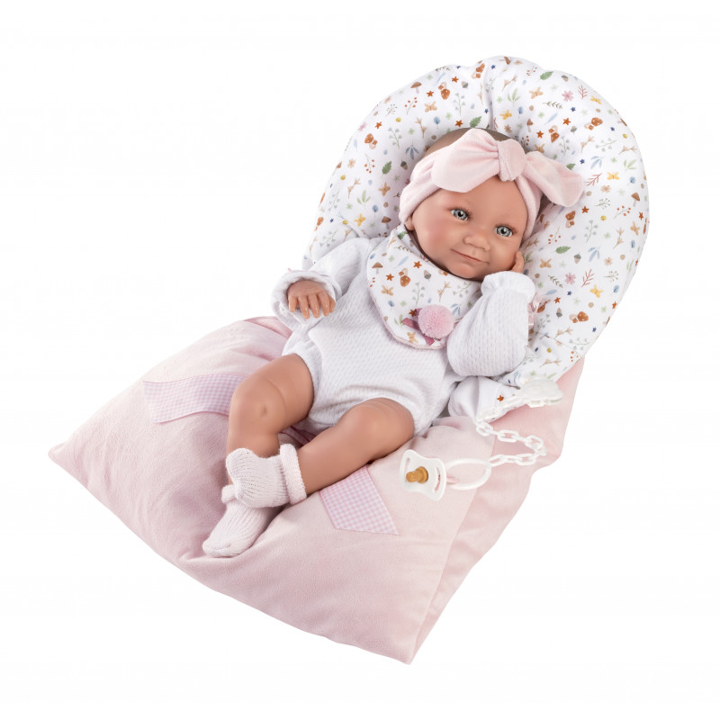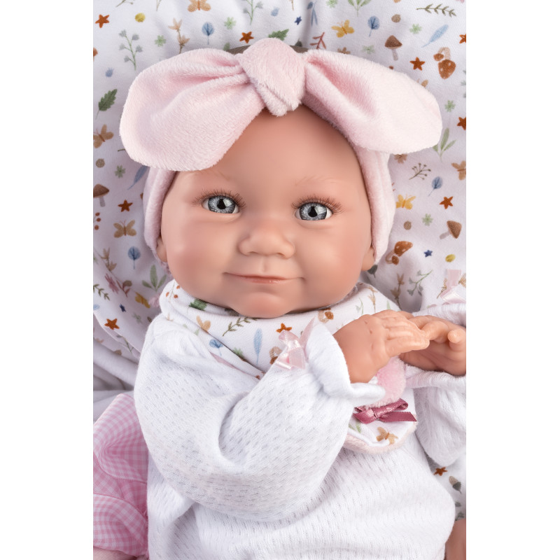 Cecilia är en babydocka utan ljud. Hon är klädd i vit body, rosa hårband, sockar och mönstrad haklapp. Napp med hållare och rosa mönstrad åkpåse ingår. Nappen går inte att fästa i munnen.