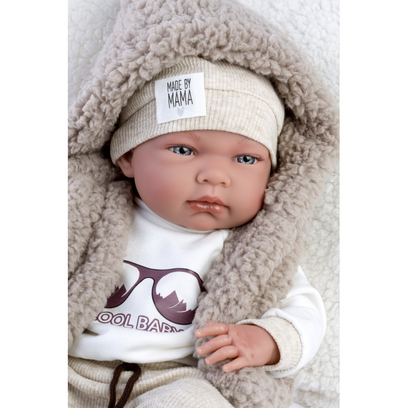 Caesar är en babydocka utan ljud. Han är klädd i vit tröja med tryck, beige byxor, strumpor, väst med luva och mössa. Napp med hållare och gosig dyna ingår.