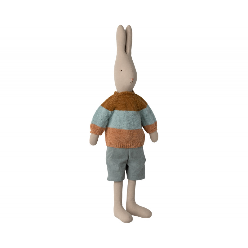 En Maileg kanin i den största storleken size 5 med stående öron. Kaninen är klädd i en stickad randig tröja och shorts.