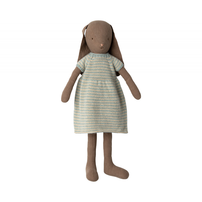 Charmig kanin från danska Maileg med hängande öron, kaninen är klädd i en randig stickad klänning i milda färger. Mått 50 cm