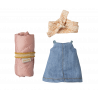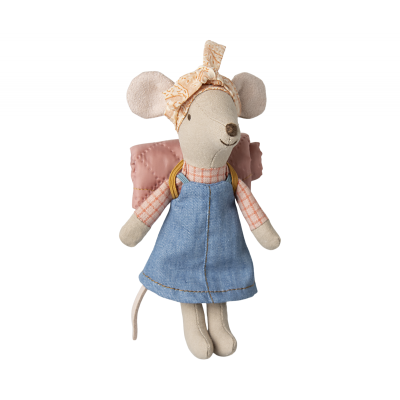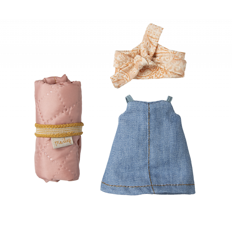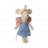 Storasyster mus hiker är klädd i shorts och stickad tröja med en rutig scarf på huvudet. En röd sovsäck ingår också.